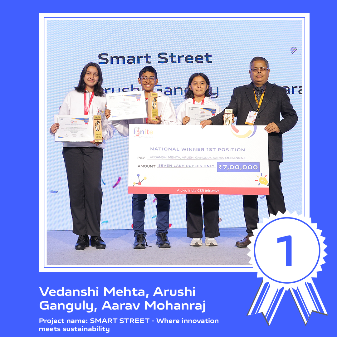 A one-stop solution to revolutionise urban infrastructure with a multifaceted approach to road safety and environmental conservation. According to a 2022 report, India saw 4,61,312 road accidents, an 11.9% increase from 2021. With the purpose of prioritising safety, a group of young innovators, Vedanshi Mehta, Arushi Ganguly, and Aarav Mohanraj devised a solution for better urban environments. They have introduced innovative features like piezoelectric tiles that convert mechanical to electrical energy and behave as sensors on the ground to prevent accidents and also power streetlights. But it’s not just about safety, they’re also helping the environment. It cleans up the air by capturing and recycling harmful CO2. Their goal is simple: to make our streets safer, cheaper, and eco-friendlier.